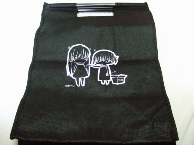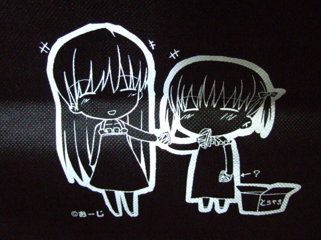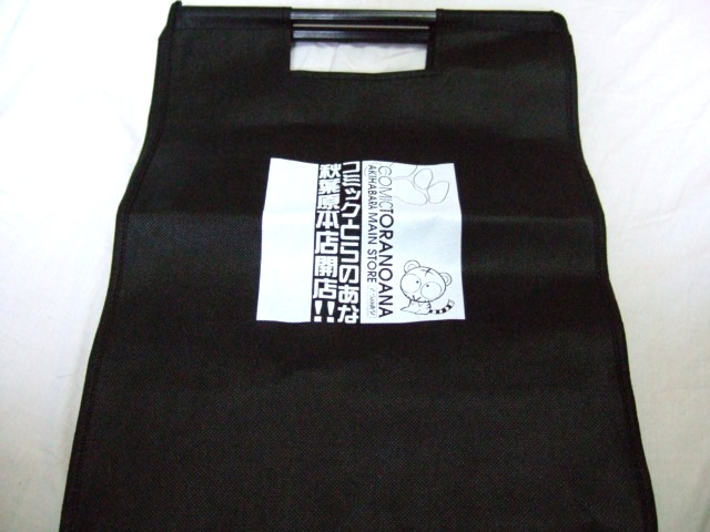 というわけで、これが(友人がゲットしてきた)とら本店グランドオープンで、とらのなんか買った人に配布された「おーじ先生デザイン、オリジナル不織布バック」。