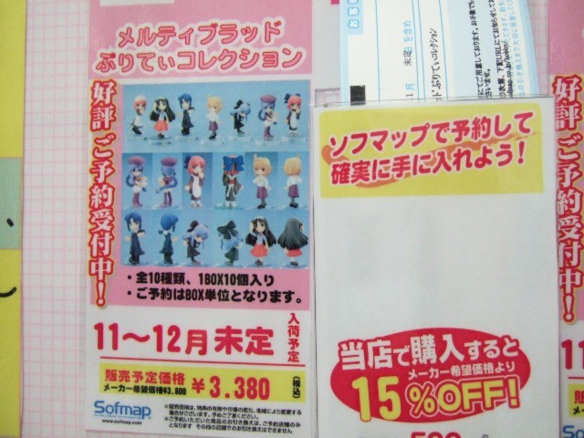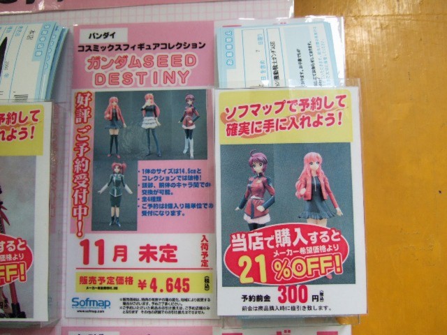 ソフマップ本店では、バンダイの「コスミックスフィギュアコレクション 機動戦士ガンダムSEED DESTINY編」(AM)と、アルターの「MELTY BLOOD メルティブラッド ぷりてぃコレクション」(AM)の予約受付が開始していました。