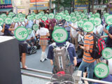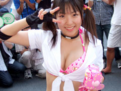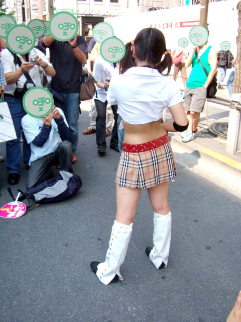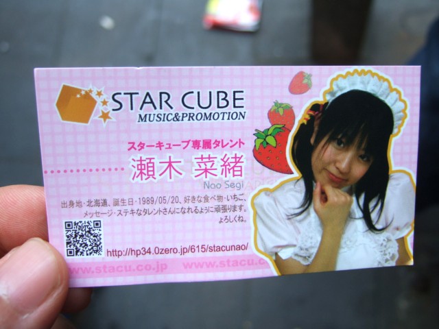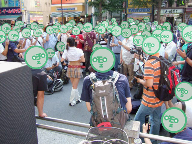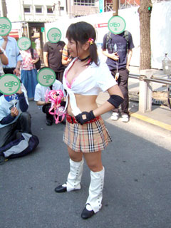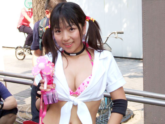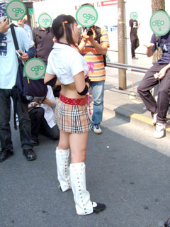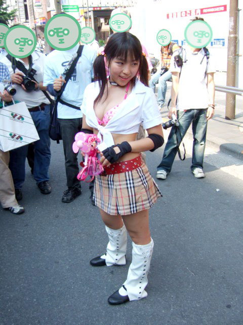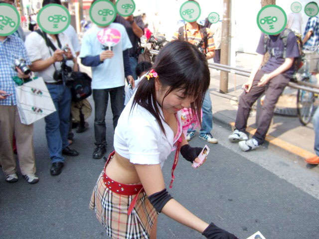以前「ランブルのキャンディのコスプレさんとメイドのコスプレさん」でお伝えしたことのある、瀬木菜緒さんが、8月6日のアキバのホコ天で、前回同様、貞本義行氏が表紙を描かれている週刊アスキー 8月15日号」にも掲載された、ランブルのキャンディのコスプレをして、名刺の配布を行っていました。やはり前回同様、大勢の人に囲まれていて、路上撮影会のような状態に。