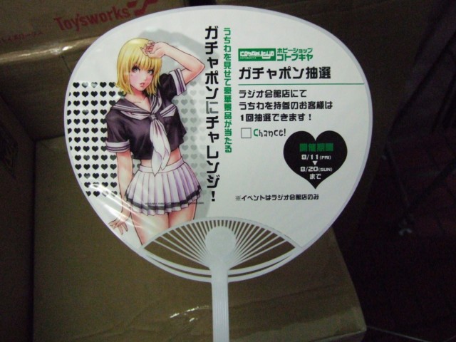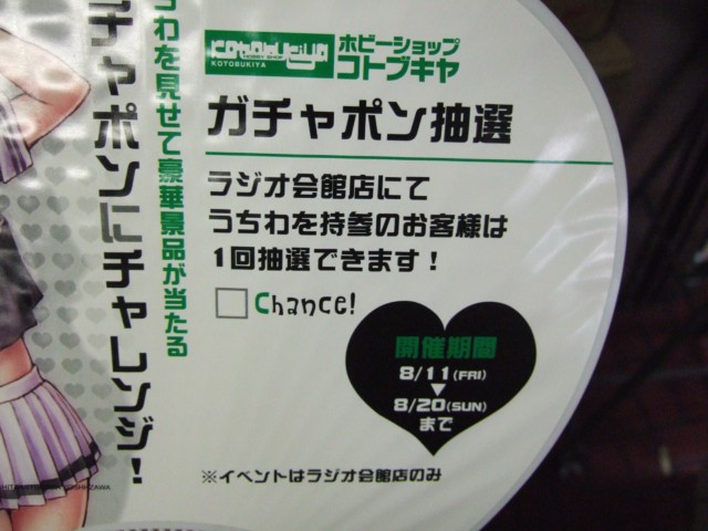 ボーナス買っ得キャンペーン実施中のコトブキヤラジオ会館では、11日から全店一斉開催 謝恩セールでも開催していた「ガシャポンチャレンジ」を8月11日〜20日に開催するみたいで、その間、この金髪セラちゃんうちわを駅前などで配布するとのこと。
