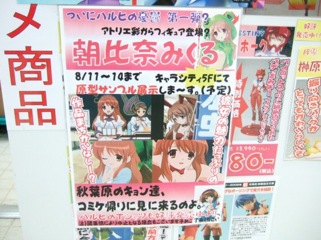 ほか、キャラシティ5Fでは、アトリエ彩の新作「涼宮ハルヒの憂鬱 朝比奈みくる」の原型を11〜14日の4日間限定公開展示との予告がありました。 一般販売の大きなサイズのハルヒ関係フィギュアの発表はコレが初めてになるのかな? どんなものか楽しみですね〜!
