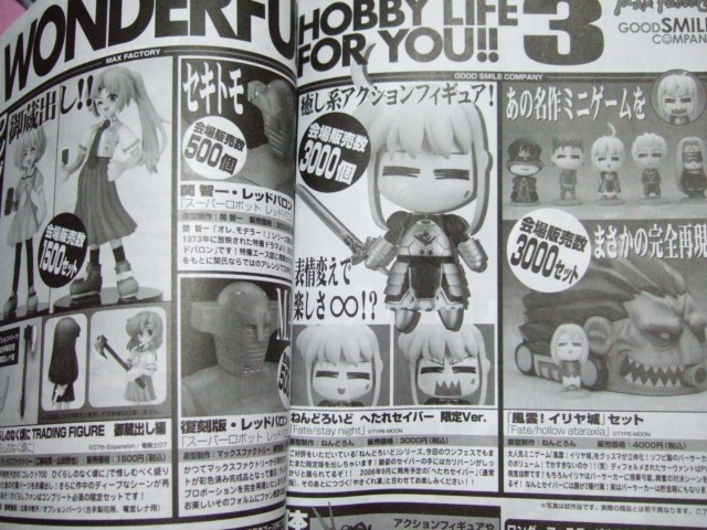マックス、グッスマの紹介ページによると、「ねんどろいど へたれセイバー 限定ver.」(参考サンプル)と、「風雲!イリヤ城セット」は、会場では各3000体を販売するみたいです。