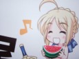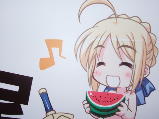 コミケ70レポ TYPEMOONブース「最後尾」看板にスイカを手に幸せそうなセイバーさん