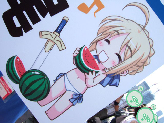 毎回ものすごい行列になるTYPEMOONのブースですが、今回もものすごい長蛇の列となっていました。その最後尾をしめす、いわゆる「最後尾」看板に、スイカを手に幸せそうな、水着セイバーさんのカワエエイラストがっ!(イラスト拡大)