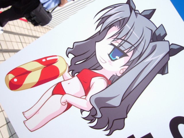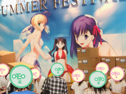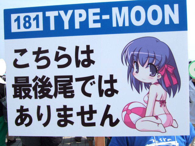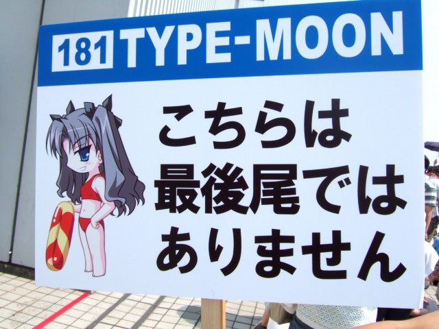 毎回ものすごい行列になるTYPEMOONのブースですが、今回もものすごい長蛇の列となっていました。その最後尾をしめす、いわゆる「最後尾」看板に、スイカを手に幸せそうな、水着セイバーさんのカワエエイラストがっ!そして、列が途中であることを示す「こちらは最後尾ではありません」看板には凛と桜のこれまたカワエエ水着イラストがあしらわれていました〜!(〃∇〃)