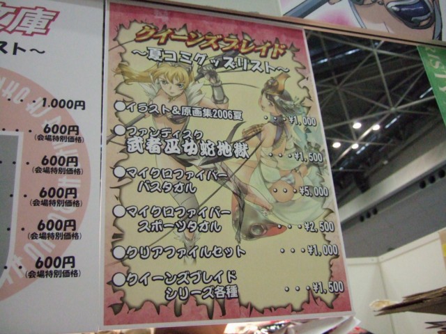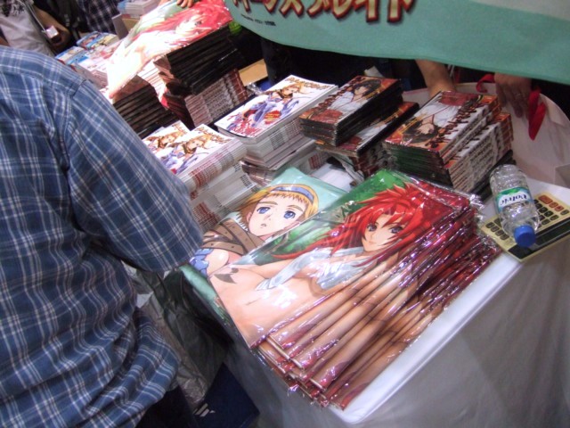 ホビージャパンのブースでは、クイーンズブレイド公式で告知されていた通り、「マイクロファイバー・バス(スポーツ)タオル」や、「クリアファイル(2種セット)」「イラスト&原画集」などの、クイーンズブレイド限定グッズの販売が行われていました。