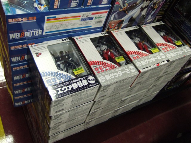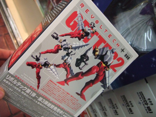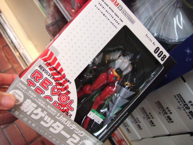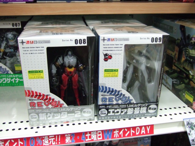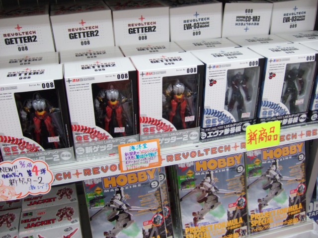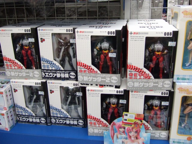 8月15日、コトブキヤラジオ会館にて、「No.1ゲッター1」「No.2 ダグラム」「No.3 ダンテ」、「No.4 EVA初号機」「No.5 EVA零号機」、「No.6 EVA弐号機」「No.7 キングゲイナー」と、毎月15日に発売される海洋堂リボルテックシリーズの「No.8 ゲッター2」(AA)と「No.9 エヴァ参号機」(AA)が発売されていました。