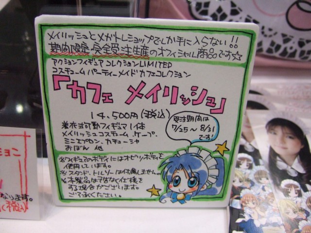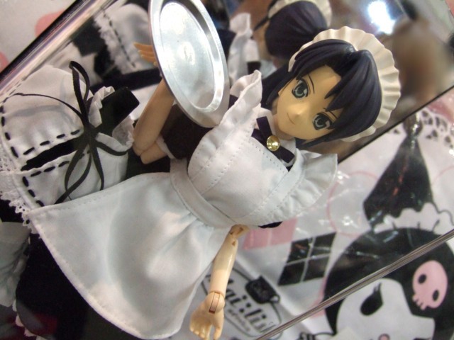 コミケ70では、アキバのメイドカフェ「メイリッシュ」もブースを出展していて、そのブースに、メガハウスのメガトレとメイリッシュでの限定販売となる、メガハウス「アクションフィギュアコレクションLIMITEDコスチュームパーティー メイドカフェコレクション カフェ メイリッシュ」のサンプル展示もされていました。これは、オビツボディを使用した、アクションフィギュアシリーズのひとつ。