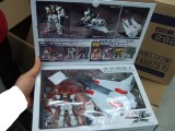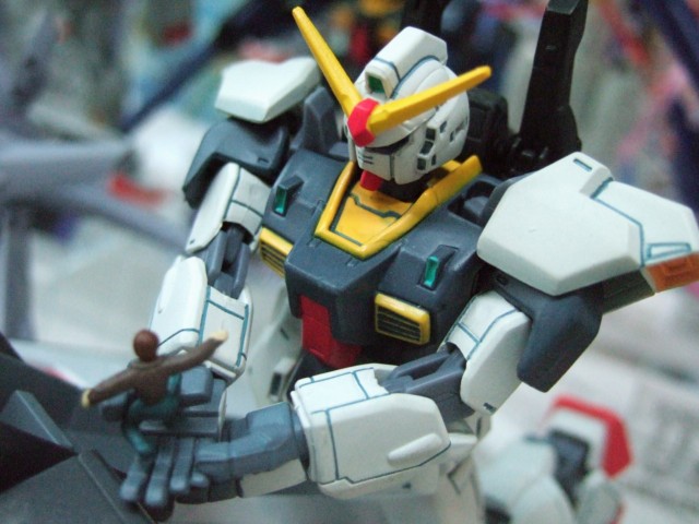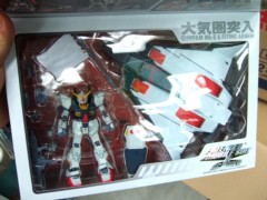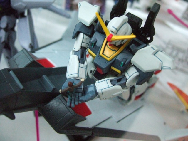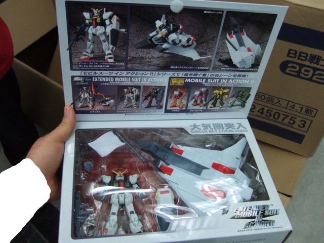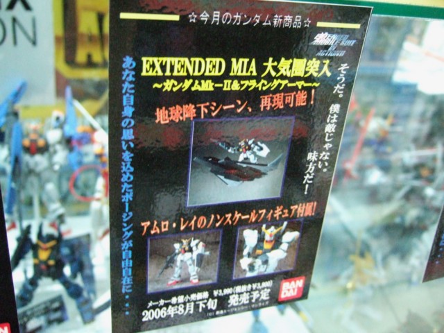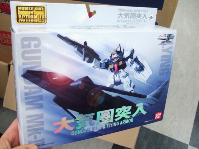 キャラシティ2Fにて、バンダイの「EXTENDED MS IN ACTION!! 大気圏突入セット 」(AA)のサンプル展示が開始しています。これは、EXMIAのガンダムMk-II(エゥーゴ)の特別カラーバージョンに、フライングアーマー、劇中のシーンを再現する白旗、アムロがセットになったもの。サンプルでは、そのアムロを抱えたポーズで展示していました。