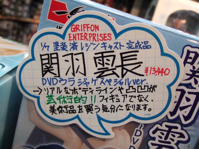 そのコトブキヤ秋葉原店では、「一騎当千 関羽雲長 DVD裏ジャケ スペシャル版」(AA)のPOPで「フィギュアではなく美術品を買う気分になります。」として、大回転でサンプルを展示していました。