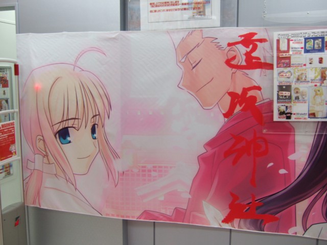 張り出されていたタペストリーには巫女セイバーと神主アーチャー、そして我らが巫女遠坂の姿が。
