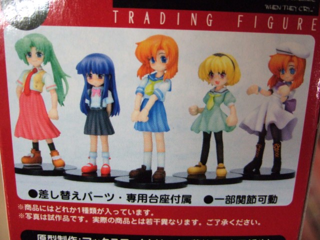 各全高約90mm〜100mmで、レナ私服・レナ制服・魅音・沙都子・梨花の全5種。一部関節可動、差し替えパーツあり。原型製作は工藤祐司氏と山田哲也氏。1BOX8個いり。