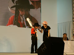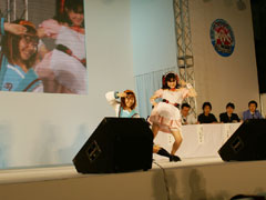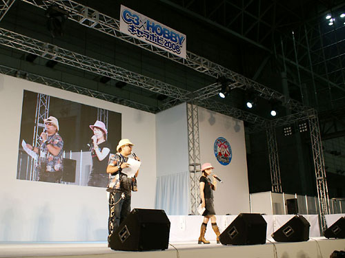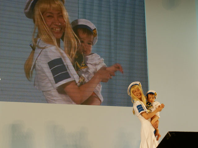 キャラホビ2006の初日最後のステージイベント「COS-PATIOオフィシャルコスプレコンテスト」では、参加コスプレイヤーさんが40組と予想より多かったのか、かなり急ピッチでの舞台進行でした。会場内の「IRF2006」特設スタジオにてラジオ生収録をされていた、声優の徳永愛さんもMCとして参加されていたりと、華やかなステージが会場に蛍の光が流れるまで行われていました。