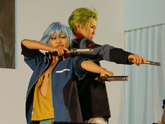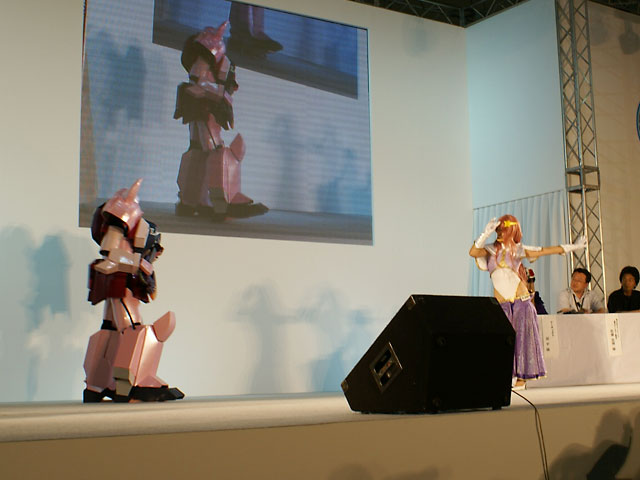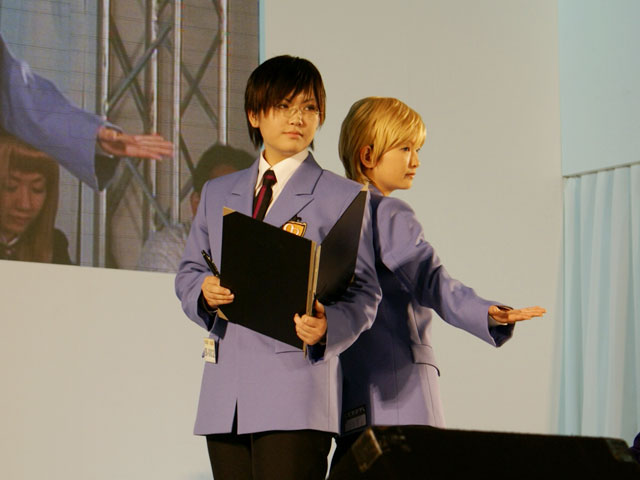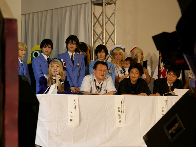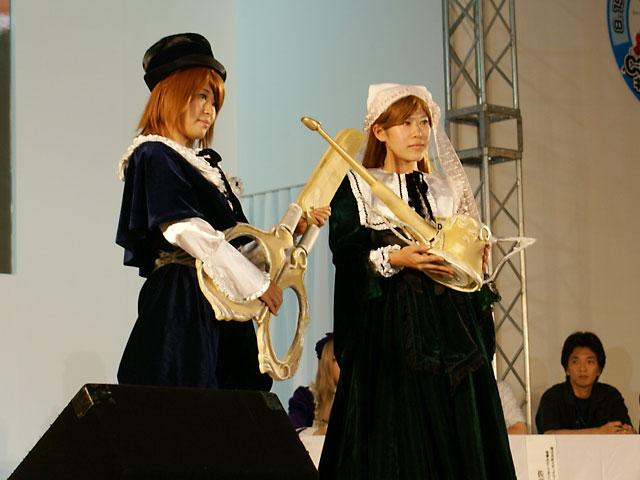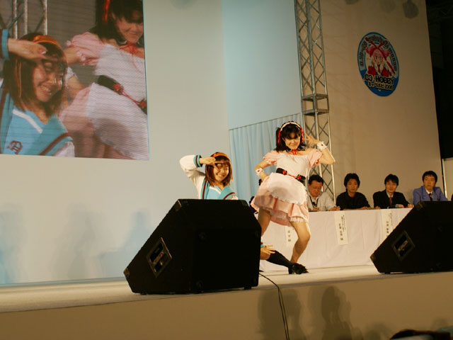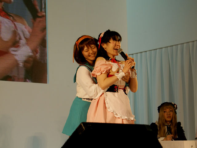 背後からハルヒに乳をもみしだかれたミクルが、「やめてくださいハルヒさん〜!」と叫ぶパフォーマンスをしたレイヤーさんと、それとは対照的に 司会の方からのポーズの合図でうなだれる絶望先生のコスプレさん・・・w