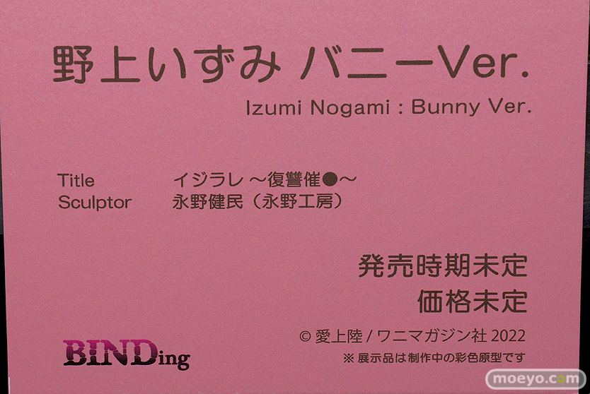 BINDingの新作エロフィギュア「イジラレ~復讐催●~ 野上いずみ バニーVer.」の彩色サンプルが、「第7回 ネイティブグループ合同展示会(エロホビ)」の会場で展示!『愛上陸氏の大ヒット作品『イジラレ~復讐催●~』より、性悪ないじめっ娘の一人「野上いずみ」を、バニースタイルで立体化。』というもので、原型制作は永野健民(永野工房)さん。彩色制作は月柳さん。その展示の様子を画像レビューとしてお伝えします!(アダルトフィギュアとなります!18歳未満の方は閲覧をお控えください。)