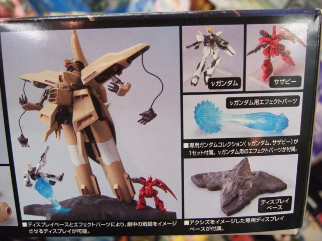 Amazonの解説によると「大型ガンダムコレクション。全高約270mm。設定どおりの通常形態・降着形態・飛行形態の3形態を完全再現。アクシズの一部をイメージしたジオラマベース付属。同スケールのガンダムコレクションνガンダムとサザビー付属。」というもの。
