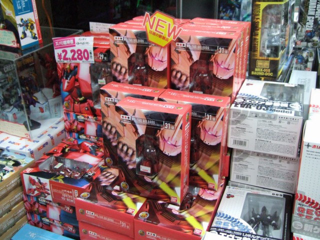 8月25日、キャラシティでラピッド試作展示がされていた、バンダイの「ガンダムコレクション 1/400 MZ-333 α・アジール」(AA)と、「HCM-Pro31 シャア専用ゲルググ」(AA)がアキバで発売されていました。α・アジールは、全高約270mmで、劇中の設定通り、通常形態、降着形態、飛行形態の3形態を完全再現したというもので、某店の店員さんによると、「ガンコレだけどガンプラ。」