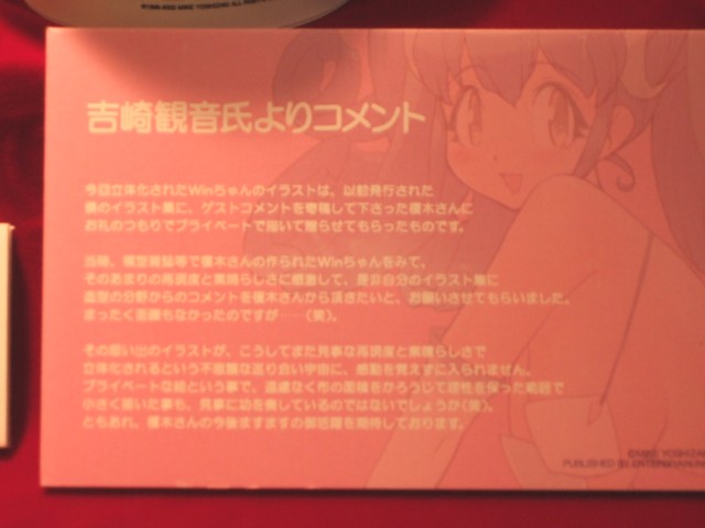 あみあみの解説によると『「Winちゃん」のパート2が登場します。「ヒメクリ イメージガール」「Winちゃん」と立て続けにスマッシュヒットを記録した人気造型作家榎木ともひで氏の塗装済み完成品フィギュア作品です。吉崎観音氏のイラスト作品を立体化した榎木氏のフィギュアの出来栄えに惚れ込んだ吉崎氏が、なんと榎木氏のためだけにイラストを書き下ろされました。そのイラストをフィギュア化したものが本作「Winちゃん2」なのです。イラスト作家と造形家の素敵な出来事をお届けいたします。』というもの。