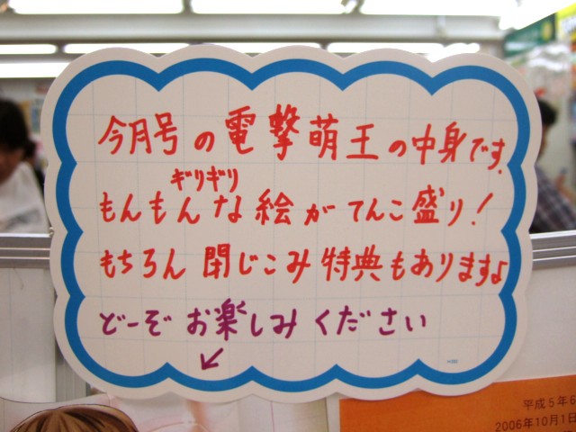「電撃大王 増刊 電撃萌王 2006年 10月号」(AA)も発売されていて、ゲーマーズ本店のPOPによると「もんもんギリギリな絵がてんこもり!」として、そのもんもんギリギリな絵のサンプルを掲示していました。