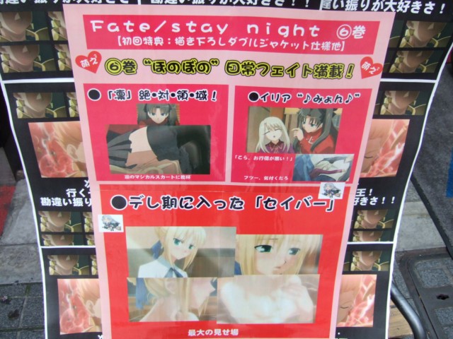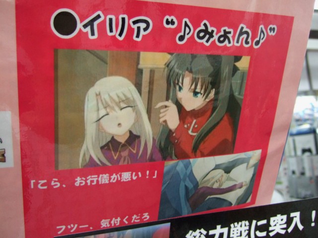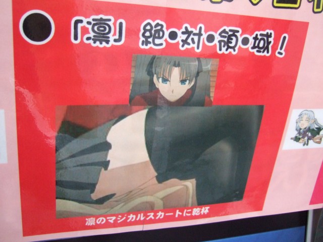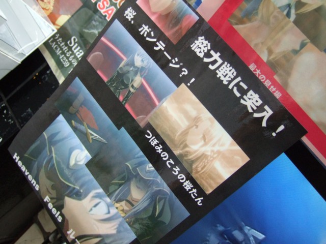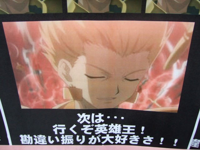ほかにも、桜のボンテージなども。 モニター下部にも大きく引き伸ばされた、『デレ期に入った「セイバー」』などが掲示されていて、その背景(?)としてはられていたPOPには、「次は・・・行くぞ英雄王!勘違い振りが大好きさ!」とした金ぴかがw