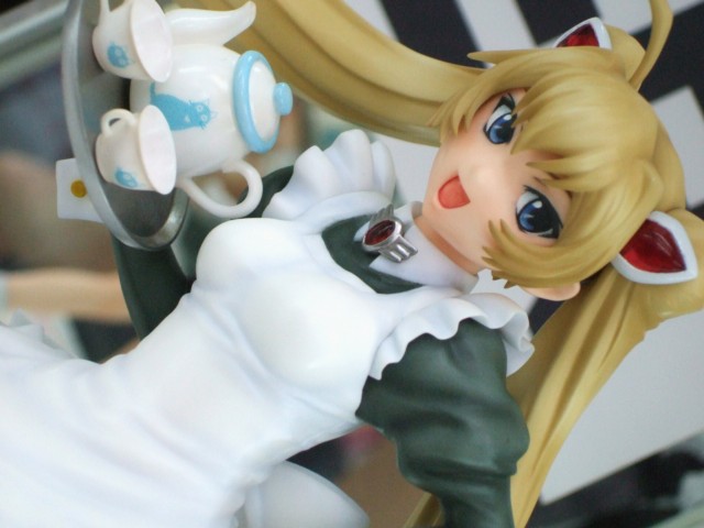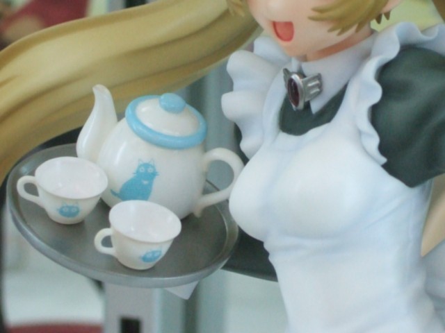 メイド服越しでもわかる大きな胸に、ものすごく細かい造形のティーセット。