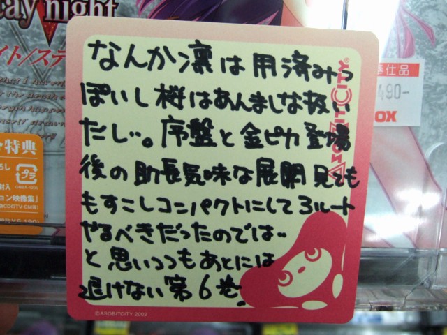 毎月のコトながら月末の発売ラッシュはすさまじく、29日にも「葉月」「シャナ2種」「クロスボーン」以外にも、サンプル展示のあったバンダイ「イクイップ&プロップVOL.5心滅獣身ガロ&魔導輪ザルバ ダメージVer.」(AA)や、デレ期に入った「セイバー」が見所(?)の「Fate/stay night 6巻」(AA)など多数の新商品が発売されていました。数が多いのでダイジェスト形式でお伝えします。
