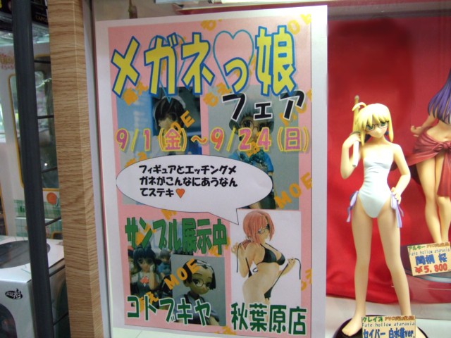 コトブキヤ秋葉原店にて、9月1日から24日までの予定で、「秋!読書!メガネ! 全国のメガネスキーさんのために集めたメガネは16種!!カンタン改造で自分だけのメガネっ娘を!!」として、「メガネっ娘フェア」が開催され、ディスプレイスペースに、1/6〜トレフィサイズまで、本来メガネをつけていない様々なフィギュアを、エッチングメガネを使い、メガネっ娘にして展示していました。