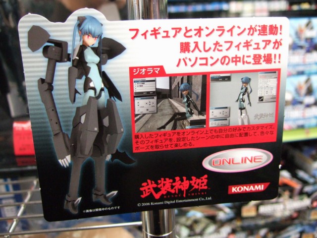 展開されていたPOPなどによると、これは、島田フミカネ氏、BLADE氏などのイラストを、浅井真紀氏が原型製作に協力したオリジナル素体「MMS(Multi Movable System)」を用い立体化。さらに、購入したフィギュア(パーツ)に付属するカードに記載されているコードを入力することによって、オンライン上でも購入したものと同じフィギュア(パーツ)を、設定したシーンの中に配置したり、パーツを組み合わせたりして楽しむことが出来るという、コナミの武装神姫シリーズ第1弾の2種のうちの一つ。