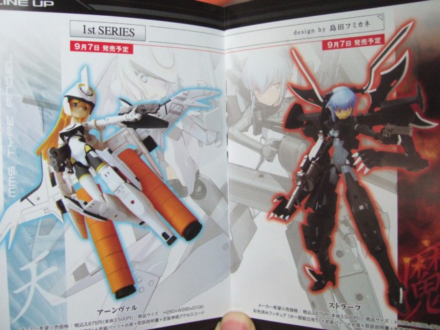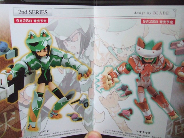 サンプル展示されていたそばには、小冊子の配布も開始していて、それによると、島田フミカネ氏イラストの武装神姫 第1弾「天使型MMS アーンヴァル」「悪魔型MMS ストラーフ」が9月7日、BLADE氏イラストの武装神姫 第2弾「猫型MMS マオチャオ」「犬型MMS ハウリン」が9月28日。