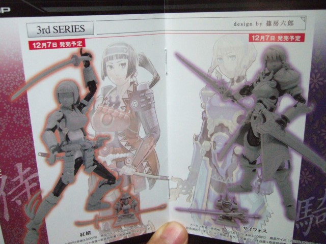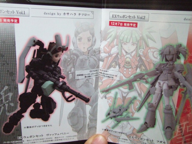 篠房六郎氏イラストの武装神姫 第3弾「侍型MMS 紅緒」(AM)と「騎士型MMS サイフォス」(AM)、カサハラテツロー氏イラストのEXウェポンセットVol.1「ヴァッフェバニー」と、GOLI氏イラストのEXウェポンセットVol.2「ツガル」(AM)が12月7日発売予定となっています。