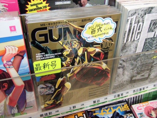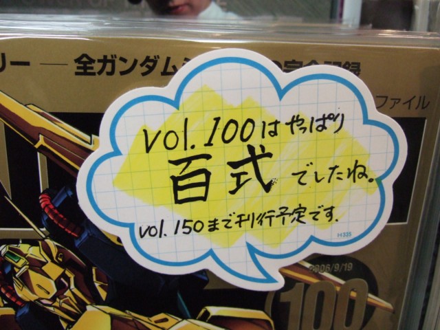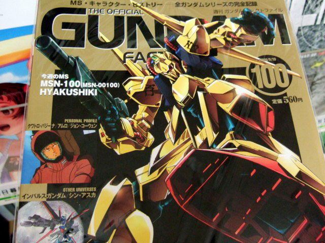 No.64の表紙がアッガイたんだったことをお伝えしたこともある、毎週火曜日発行の、8つの章を少しずつファイリングしていって、最終的にはすべてのガンダムシリーズの一大資料ファイルとなるという「ガンダムファクトファイル」のNo.100が9月5日に発売されました。今回の表紙は百式となっていて、コトブキヤラジオ会館のPOPによると「Vol.100はヤッパリ百式でしたね」との事。
