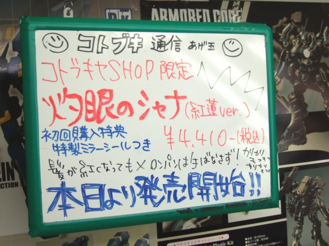 また、コトブキヤ限定なので、入荷する予定のないキャラシティにも、なぜか以前からサンプルが置かれていて、POPには「300m先にて販売?予定?」とかかれていました。