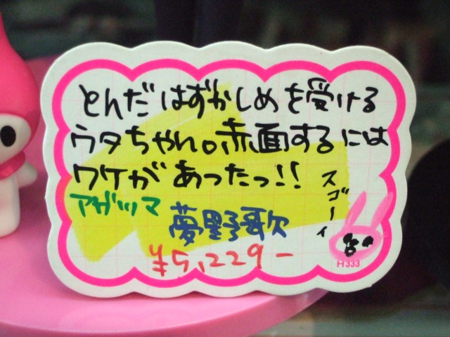コトブキヤラジオ会館では、いつからかはわかりませんが、POPに「とんだはずかしめを受けるウタちゃんっ!赤面するにはワケがあった!!」として、その赤面の理由をわかりやすく(?)展示していました。