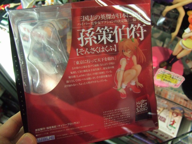 ウェーブの商品説明によると「あの超人気作品が、PVC完成品となり、満を持して登場!! かつて、ビージェイ(当社直営店)限定販売ガレージキットで商品化し、その後『電撃ホビーマガジン誌&フィギュアマニアックス誌』誌上限定通販のポリストーン製完成品として商品化された、あの『孫策伯符』が、PVC完成品として商品化することが決定いたしました。今や人気原型師の筆頭に上げられる桜坂美紀により手がけられた本作は未だに根強い人気があり、再リリースの要望が絶えませんでした。そのような中、昨今のPVC商品の著しいクオリティーアップにより、遂にPVC完成品での商品化を決定いたしました。PVC化にあたり、1/7スケールというビッグサイズを、クオリティーダウンすることなく忠実に再現できる大きさとして、1/10スケールサイズにサイズダウン。二千円台というリーズナブルな価格且つ、コレクションにもっとも適したサイズと致しました。本製品は全国のホビーショップなど、ウェーブ商品取扱店にてお求め頂けますが、諸事情により5000個限定販売となりますのでお早めに最寄のホビーショップなどでご予約下さい。 」というもの。