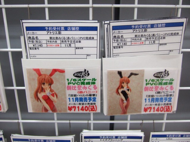 みんなの期待にこたえて・・・ とったど〜」もあった、「ホビー部門が遂に最上部に見放された」らしい、とらのあな本店5Fホビーフロアですが、9月9日には、アニメ第3話で着ていたようなバニーガール姿のハルヒが、キャラシティで原型サンプル展示もされていた、アトリエ彩の「1/6 朝比奈みくる バニーガール(赤)」(AM)の看板を持って売り込み?をしていました。