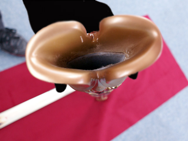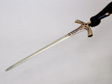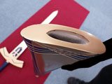 鞘の中はフェルトが入っているので、収めるときに擦って塗装が落ちるという心配は極力押さえられています。 刀身は当初メッキを試していたものの、メンテナンス性ほか、色々と考慮した結果、塗装になったとのことですが、ご覧の通りの輝き。話によると、陽の光に当たると金色に輝くのだそうです。