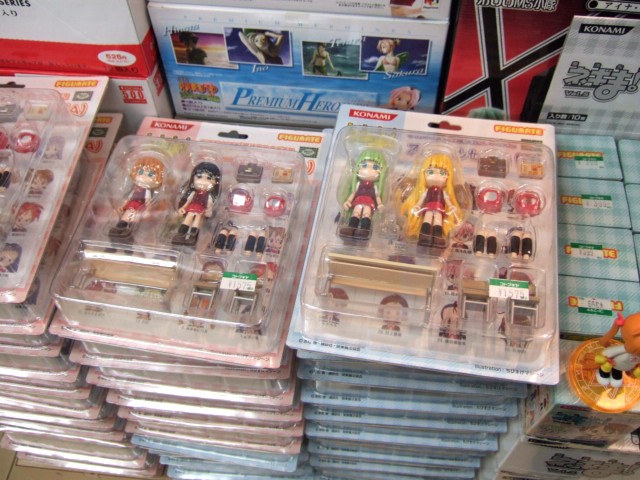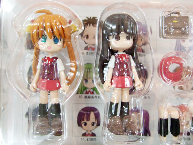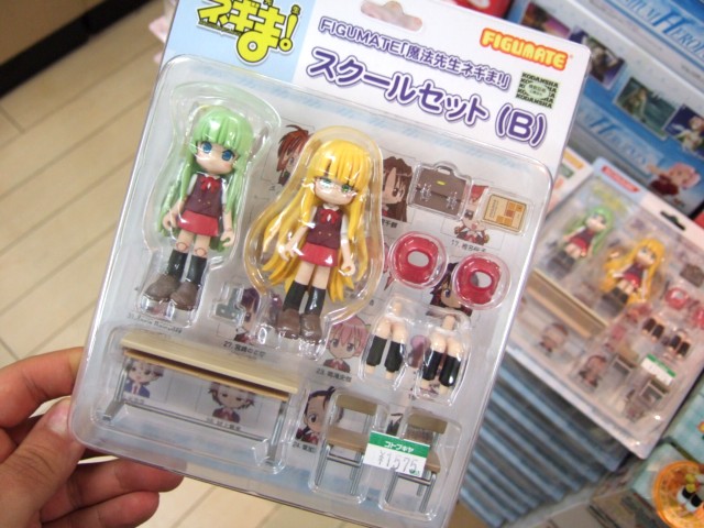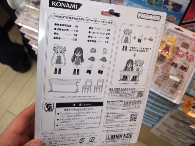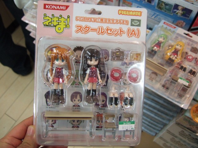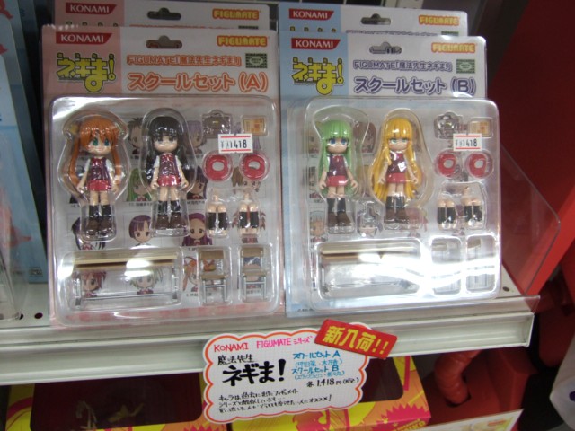 9月12日、アキバにて、コナミのフィギュメイト 魔法先生ネギま!「スクールセットA」(AM)と「スクールセットB」(AM)が発売されていました。これは、座り用パーツ、小物、机、椅子などが付属したブリスターパッケのセットで、とらのあな本店によると「どうしても座らせたい人にオススメ!」というものみたいです。ほか、コナミの新作フィギュア2点も出ていたのでまとめてお伝えします。