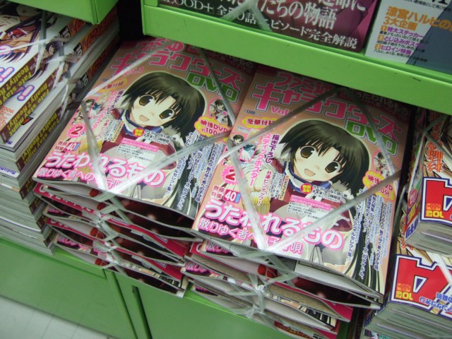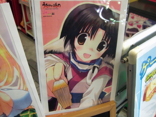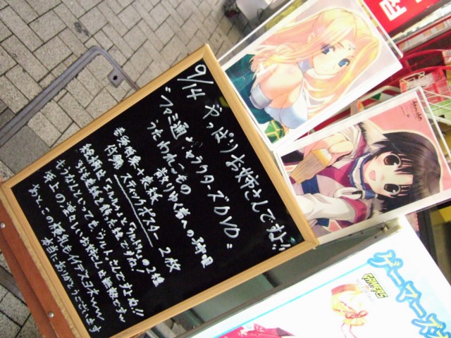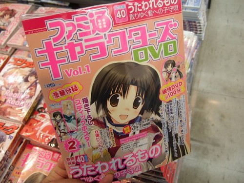9月14日、アキバにて、「ファミ通キャラクターズDVD Vol.1」(AA)が発売されていました。Vol.1となる今回の特集はPS2「うたわれるもの 散りゆく者への子守唄」(AA)となっていて、ゲーマーズ本店では付録のスティックポスターのサンプルを掲示し、「年上の凛々しいお姉さんは無敵ですw あと、この横乳もイイデスヨネww 本当にありがとうございます」と書かれていました。