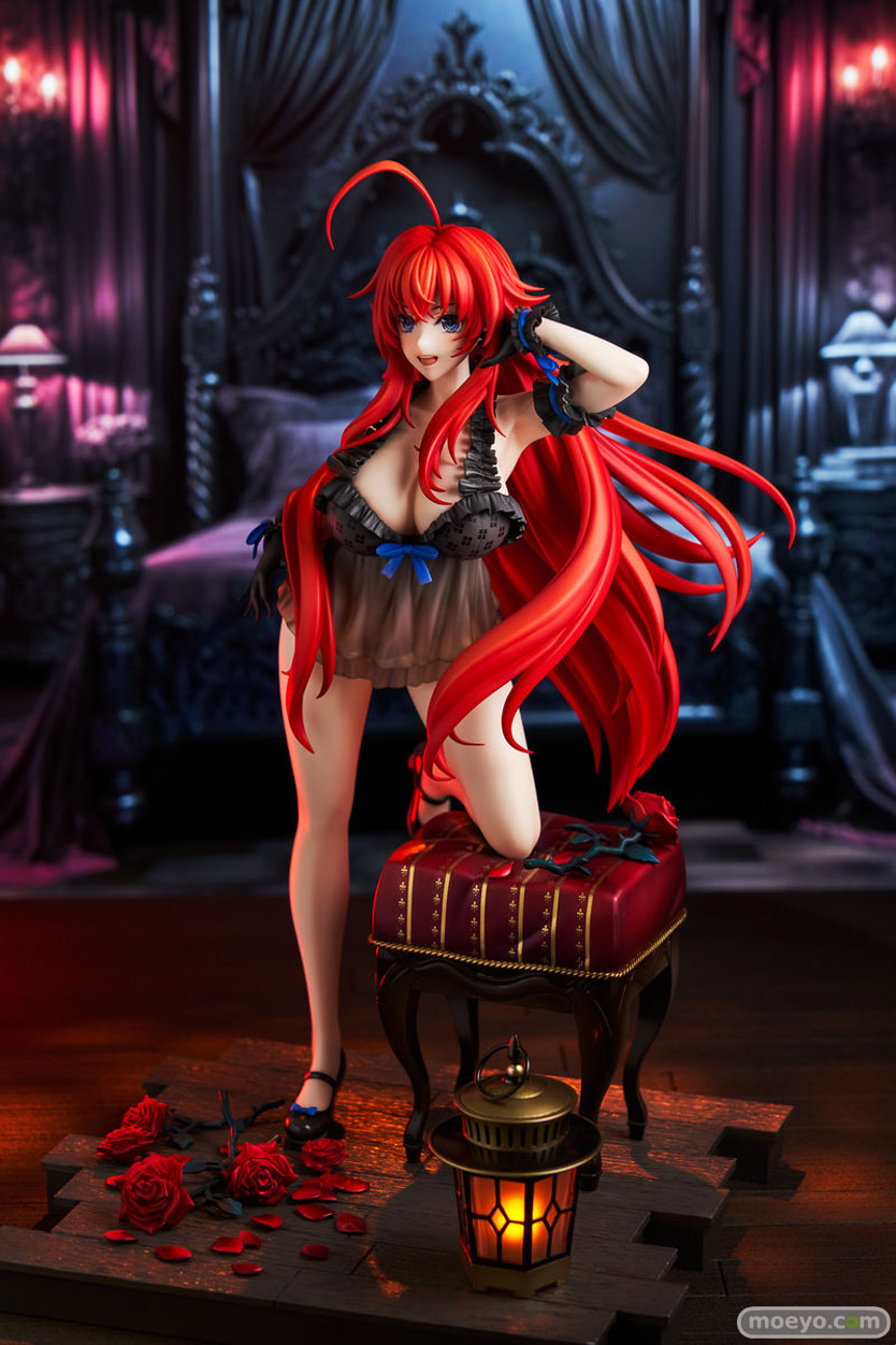 リアスの豊満なボディを包む半透明のキャミソールは秘蜜のギミックで再現され、その美しさを引き立てます。リアスの少し照れた笑顔と妖艶な表情の2つの顔をお楽しみいただける仕様になっています。台座は朱乃と組み合わせることができ、真紅のバラやスツールも忠実に再現、さらに、台座のランタンには別売のミライトをセットすることで、イラストの輝きを再現できます。