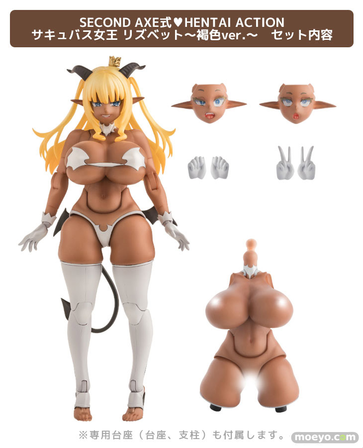 セカンドアックスの新作エロアクションフィギュア「朝凪氏オリジナルキャラクター SECOND AXE式❤HENTAI ACTION サキュバス女王 リズベット~褐色ver.~」が予約受付開始!『アクションフィギュアとしても素体としても好評を博した「サキュバス女王」の褐色ver.が早くも登場!朝凪氏の徹底監修の元、氏の描く肉感的なプロポーションと可動が両立した意欲作。これまでのシリーズ同様、全身の圧倒的な可動域はもちろん、新たに弊社にて特許を取得した「脇を魅せる」肩関節は必見の価値アリ!』というもので、原型制作はベンチマアクさん。そのサンプルの様子を、画像レビューとしてお伝えします!(アダルトフィギュアとなります!18歳未満の方は閲覧をお控えください。)