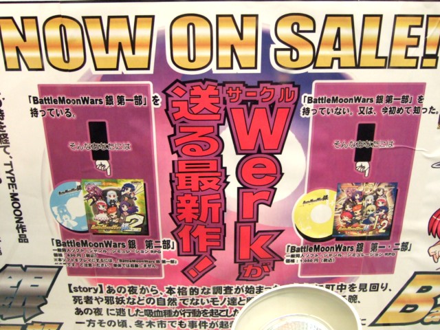 とらのあな1号店にて、サークル「Werk(ヴェルク)」のBattleMoonWars銀の追加ディスク「第二部」と、第一部、第二部を両方収録した「第一・二部」が9月17日に発売されました。これは、TYPE-MOONのキャラクターを用いた二次創作のSRPGで、とらのあな1号店の店頭ディスプレイでは、二部から新登場となるカレンをやたらプッシュしているのか、いたるところにカレンがいました。