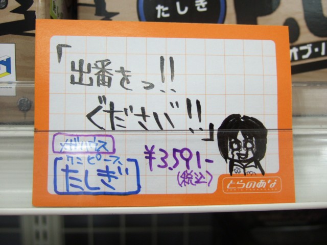 8月5日にグランドオープンした、とらのあな本店5Fの「最上部に見放された」ホビーフロアでは、オープン当時から、1号店時代には見かけることのなかった、つくりものじ氏風にへたれ化されたキャライラストに一言コメントが書かれたPOPを見るようになりました。その一言が販促というよりは、思わずにやりとするものや、ふきだしてしまう内容のものが多く、とても面白いので、店舗にあったもの全てではないですが、オープンの8月5日から、9月18日までに見かけた50枚くらいのPOPをまとめてのっけておきますw(画像拡大して上の 次へ> で連続してみると楽かも?)