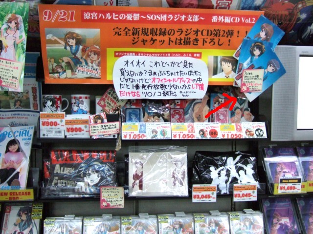 涼宮ハルヒの憂鬱のドラマ(?)CD「ラジオ「涼宮ハルヒの憂鬱〜SOS団ラジオ支部〜」番外編CD Vol.2」(AA)が発売されていました。ほか、「MC★あくしず vol.2」(AA)、海洋堂「BOMEコレクション第15弾 デッド オア アライブ かすみ BLUE Ver.」(AM)(サンプル展示)、バンプレストプライズ「うる星やつら DXフィギュア 第2弾」(AM)発売とか、9月20日のアキバのよろずネタを。