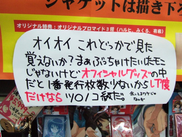 ゲームシティでは、特典としてハルヒ・みくる・有希のオリジナルプロマイド3枚が付属するみたいで、POPによるとこの特典、「レア度だけはツチ○コ級」みたいですw