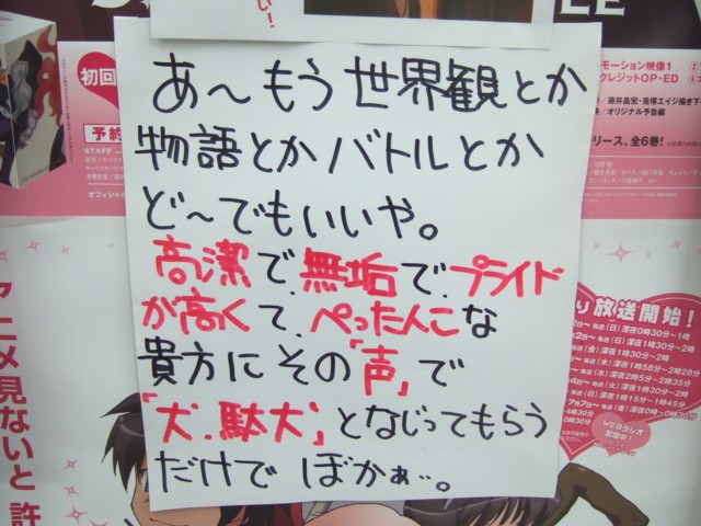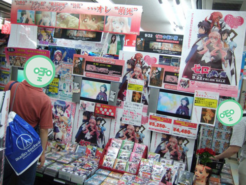 ゲームシティでは、DVD「ゼロの使い魔 Vol.1」(AA)がおおきく展開されていて、「”高飛車””ドジッ娘””絶対領域””貧乳””そしてツンデレ ・・・オレ”萌死”」と書かれたPOPや、、「あ〜もう世界観とか物語とかバトルとかど〜でもいいや。高潔で、無垢で、プライドが高くて、ぺったんこな貴方にその声で「犬、駄犬」となじってもらうだけで ぼかぁ・・。」と書かれた書きなぐりPOPなどがありました。