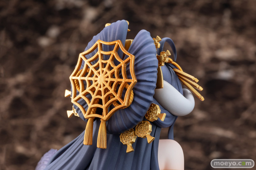 いつもの白いドレスと異なる黒の振袖には、金銀で描かれた蜘蛛の意匠が。大きく結い上げた髪の後ろにも、蜘蛛の巣の髪飾りが光ります。