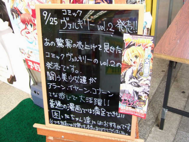 アキバの各書店では、「COMIC(コミック)ヴァルキリー 10月号」(AA)が発売されていて、ゲーマーズの立て看板では「当店では18禁です。本当にありがとうございました」とされていました。
