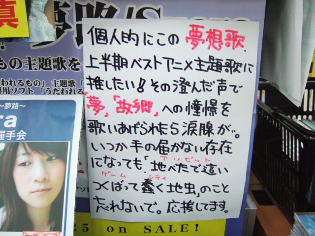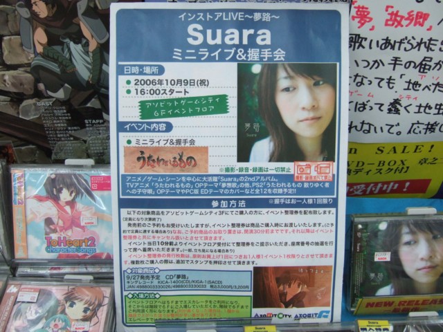 キャラシティの殴り書きPOPによると、「上半期のベストアニメ主題歌に推したい!」という、アニメ「うたわれるもの」の主題歌「夢想歌」を収録したSuaraさんのCDアルバム「夢路」(AA)も発売されていました。