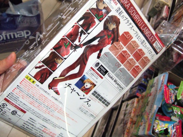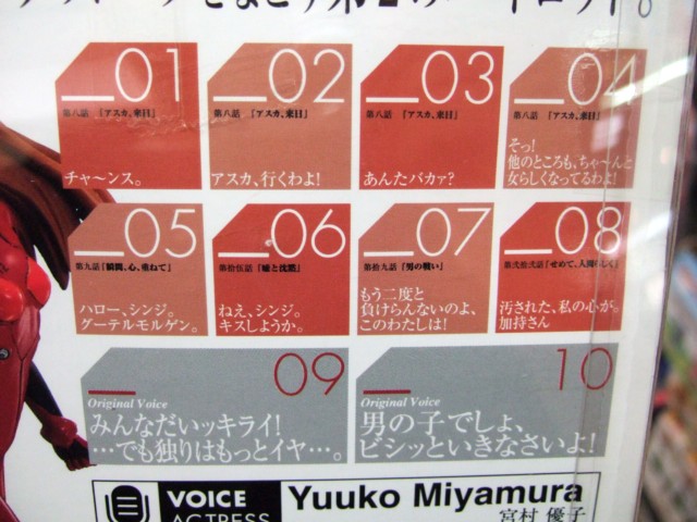 「新世紀エヴァンゲリオン Voice I-doll Superior 惣流・アスカ・ラングレー」(AA)のパッケ表裏。一番右の画像は、パッケ裏面に記載されているセリフ10種。