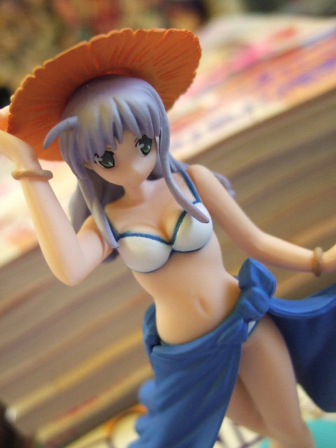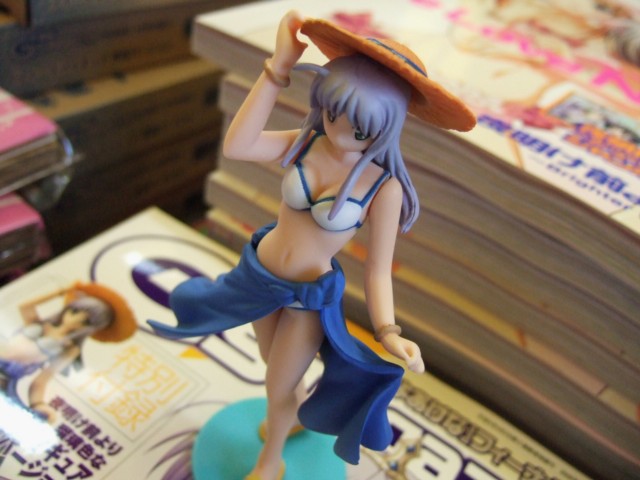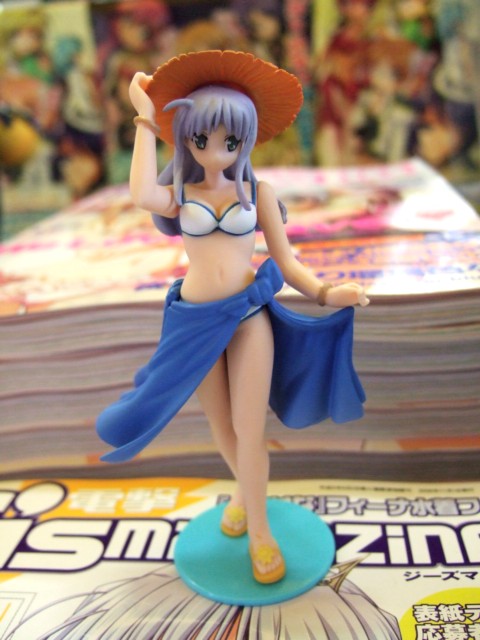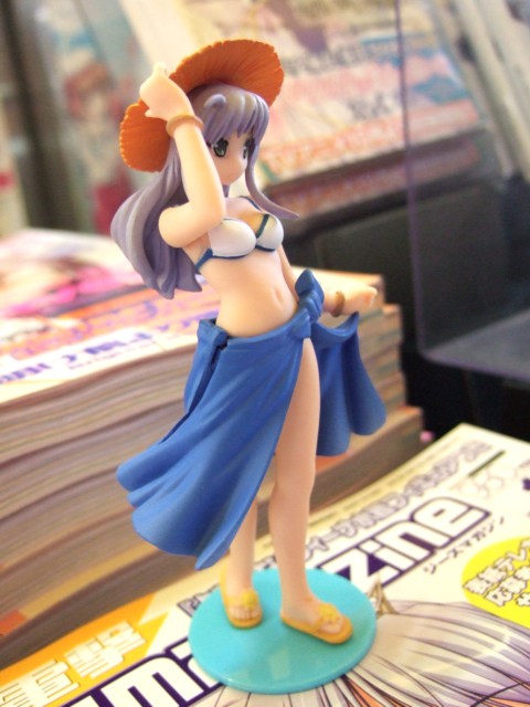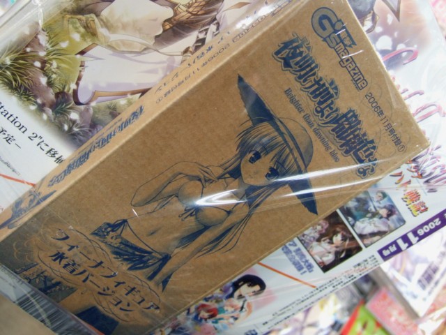 9月30日、ワンフェス2006夏キャラアニブースでも展示されていた、フィーナ姫水着フィギュア付の「電撃G’smagazine 11月号」(AA)が発売となりました。これは「夜明け前より瑠璃色な」の6号連続表紙&3号連続付録開始の第1冊目となるもの。ゲーマーズ本店では店頭で「電撃姫 11月号 」(AA)と一緒に販売を開始していて、フィーナ姫水着フィギュアのサンプルも展示してました。